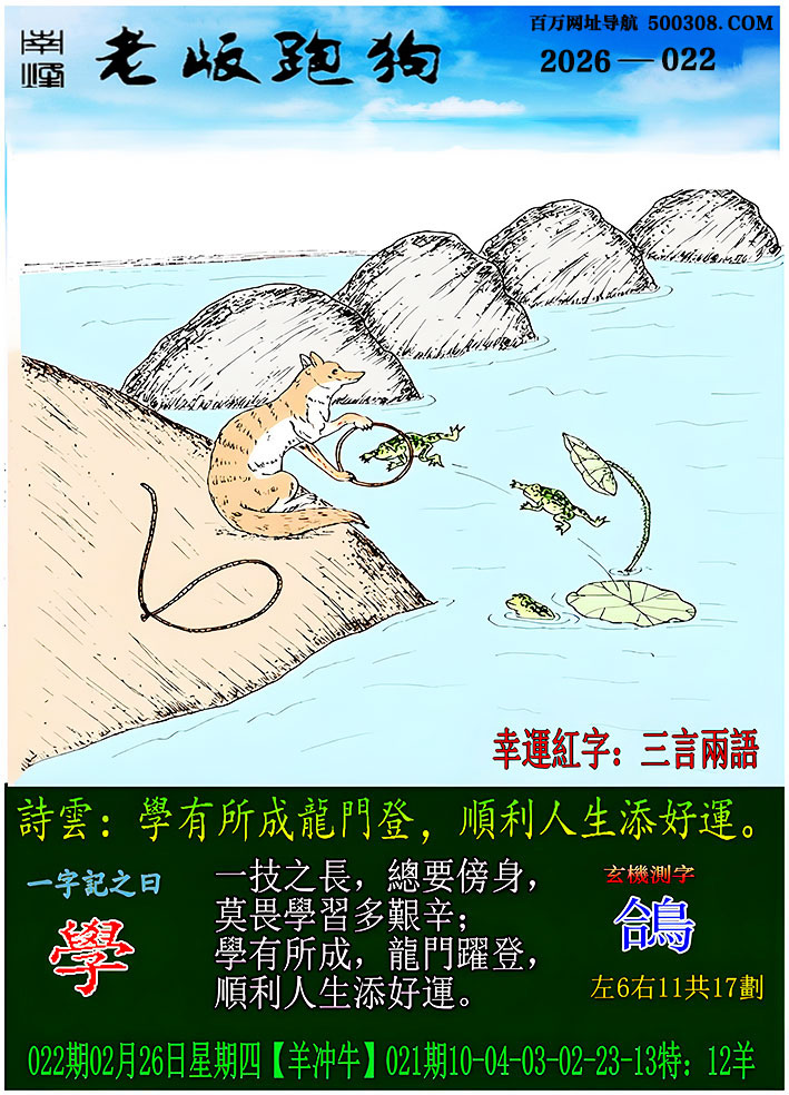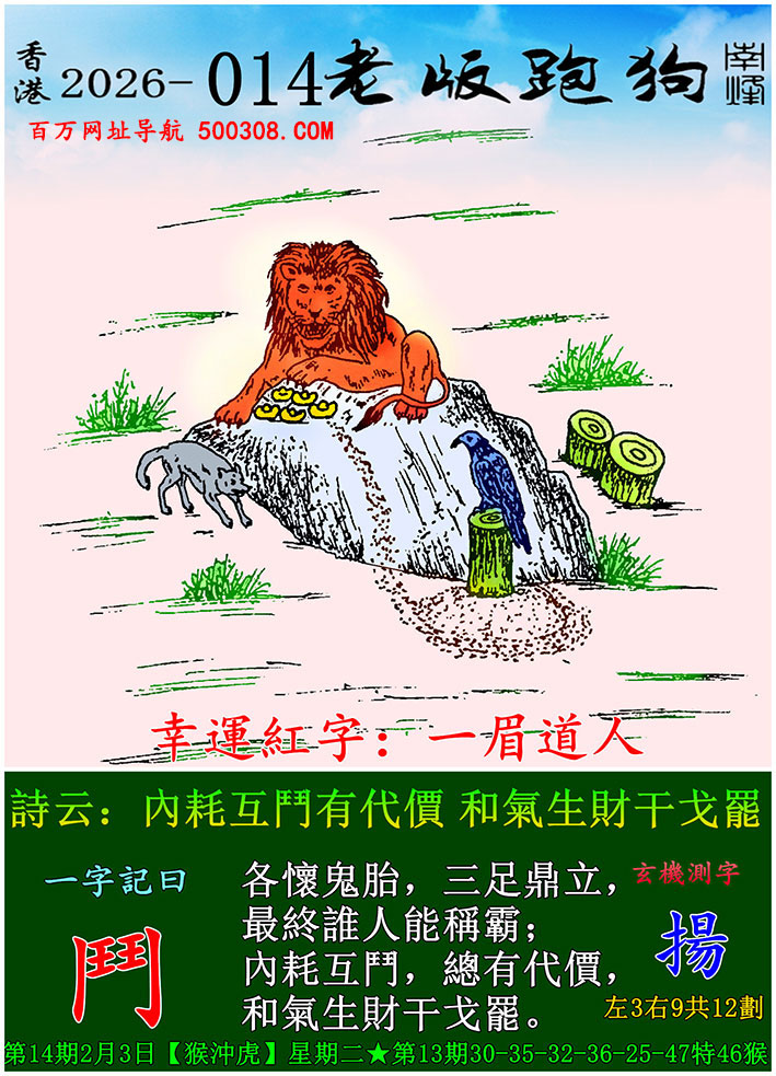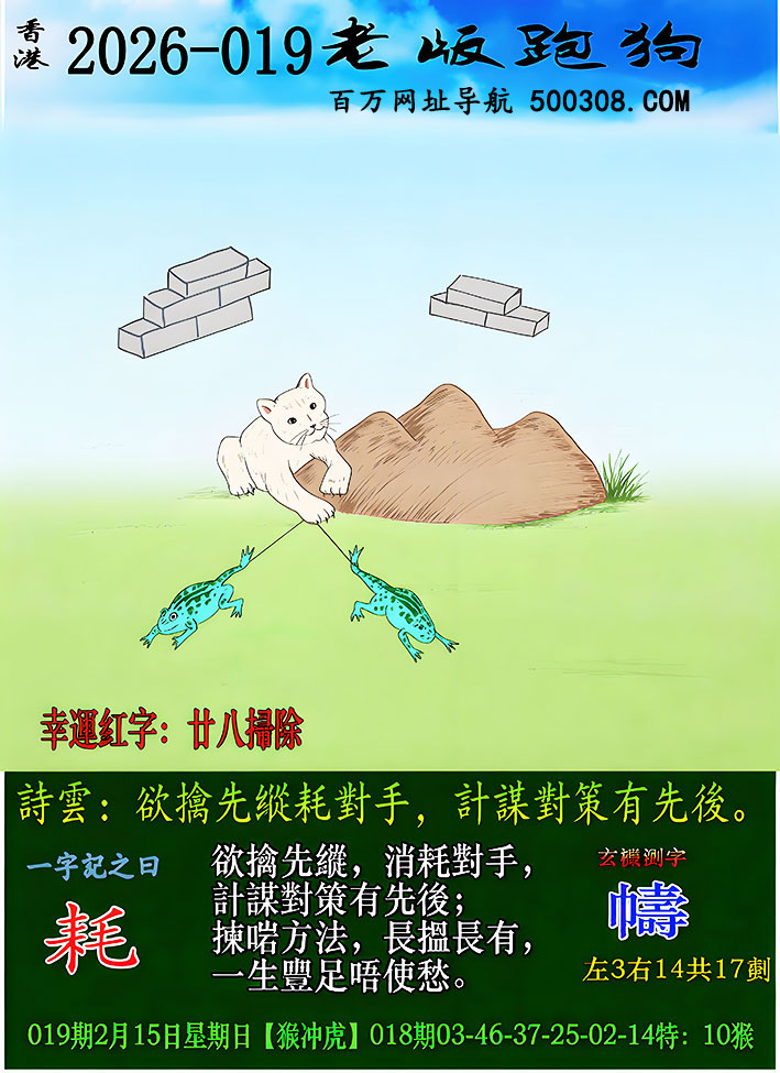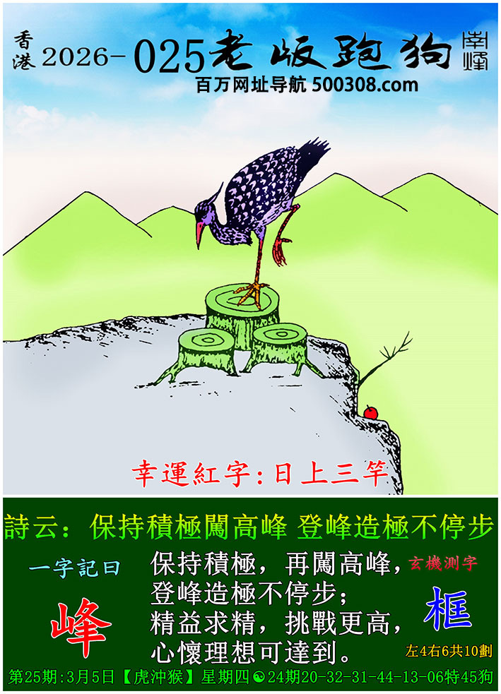 027期跑狗图:一字記之曰:【雙】 不辭萬裏,雙影掠空。 羽剪東風,影落崖層。玄機測字:《跳》 一語中特:三頭六臂