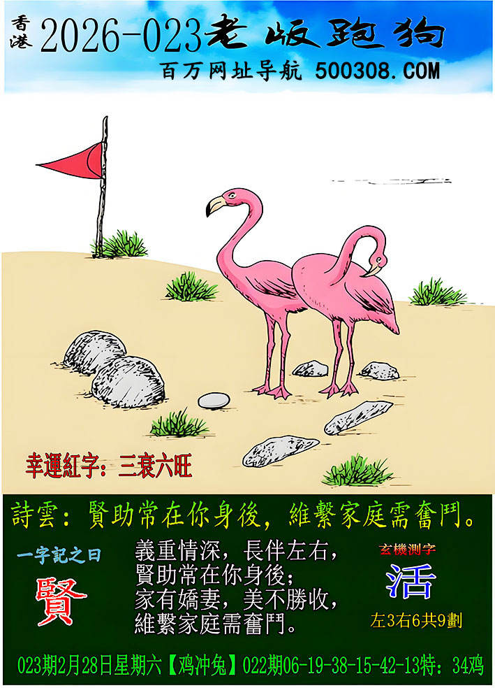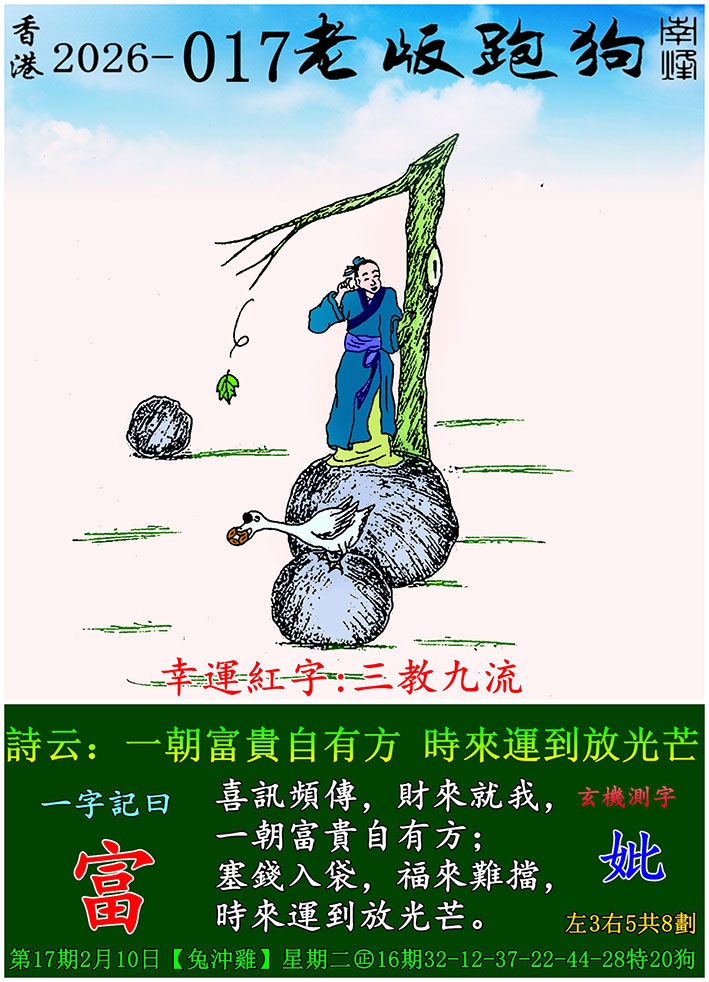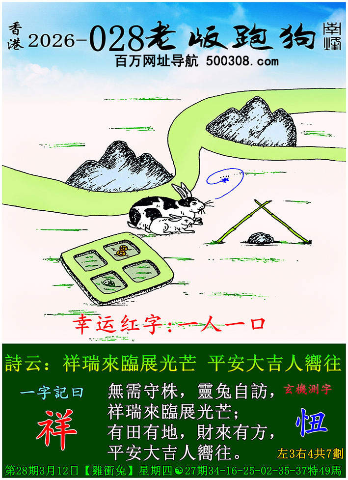 028期跑狗图:一字記之曰:【鶴】 石後藏踪,心隨鶴動。 目注雙禽,卷繩欲牽。玄機測字:《歡》 一語中特:四方八面