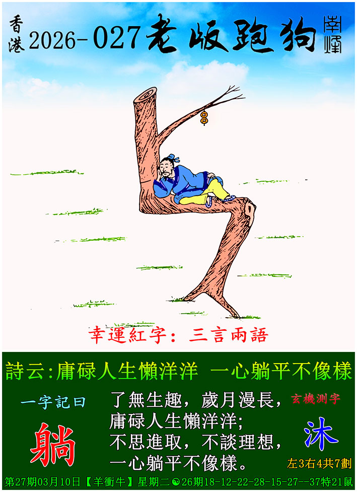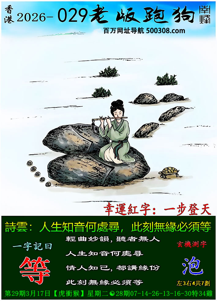 031期跑狗图:一字記之曰:【數】 筆畫石面,字刻上端。 時光有數,歲月留斑。玄機測字:《境》 一語中特:一言九鼎