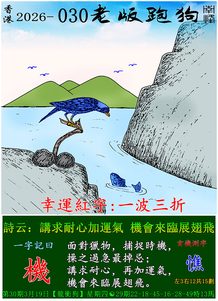 030期跑狗图:一字記之曰:【捉】 垂翼探水,尖嘴巧捉。 長風逐浪,得魚而歸。玄機測字:《欽》 一語中特:三長兩短